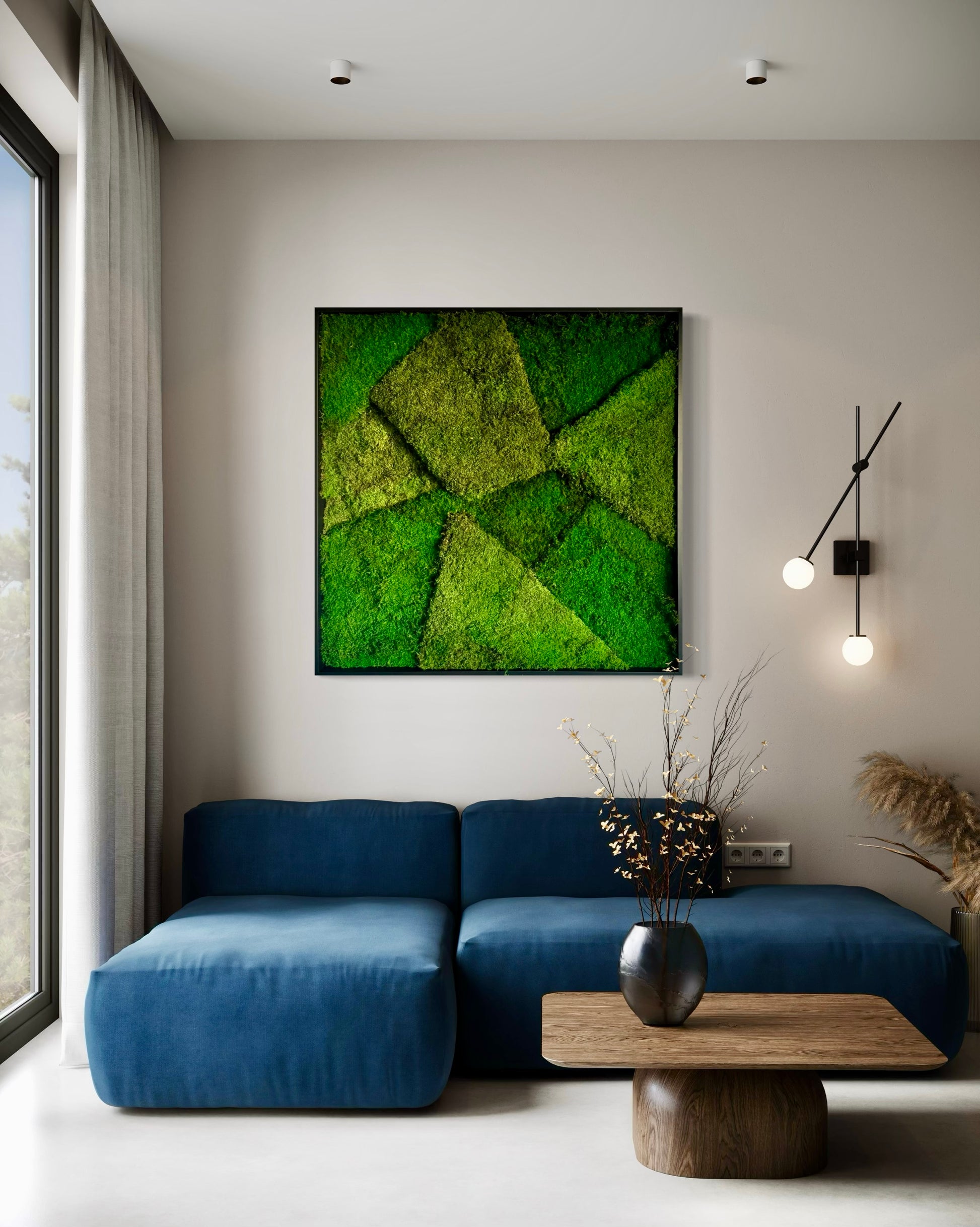 Sought to evoke the feeling of old architectural stone remains reclaimed by nature. The moss overgrowth, carefully arranged on each "layer," reflects nature's ability to soften and transform man-made structures over time. This interplay of texture and form harmoniously captures the serenity of untouched landscapes. Perfect for adding a biophilic touch to any space, this mostly maintenance-free artwork symbolizes the balance and resilience found in the natural world.
