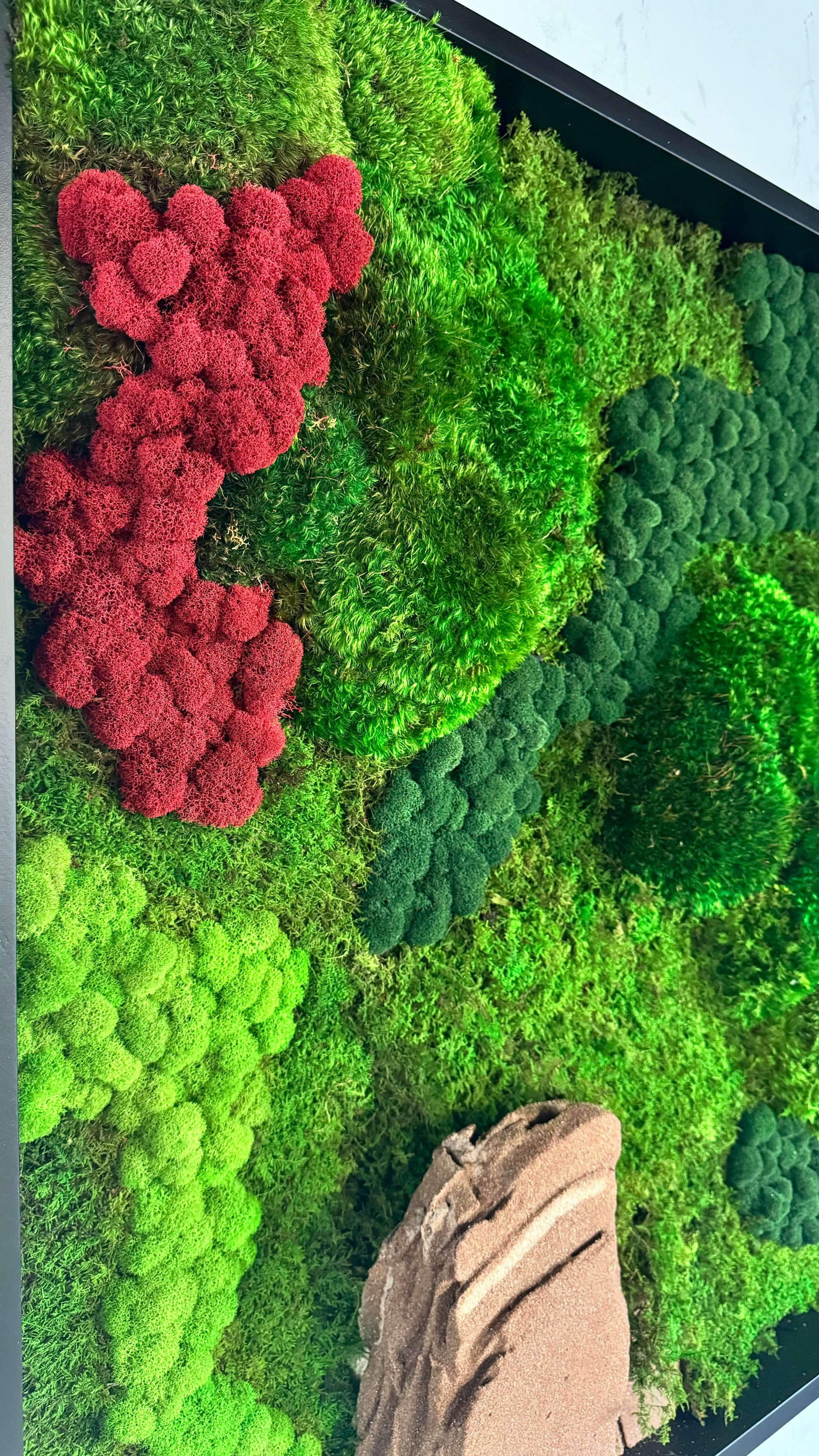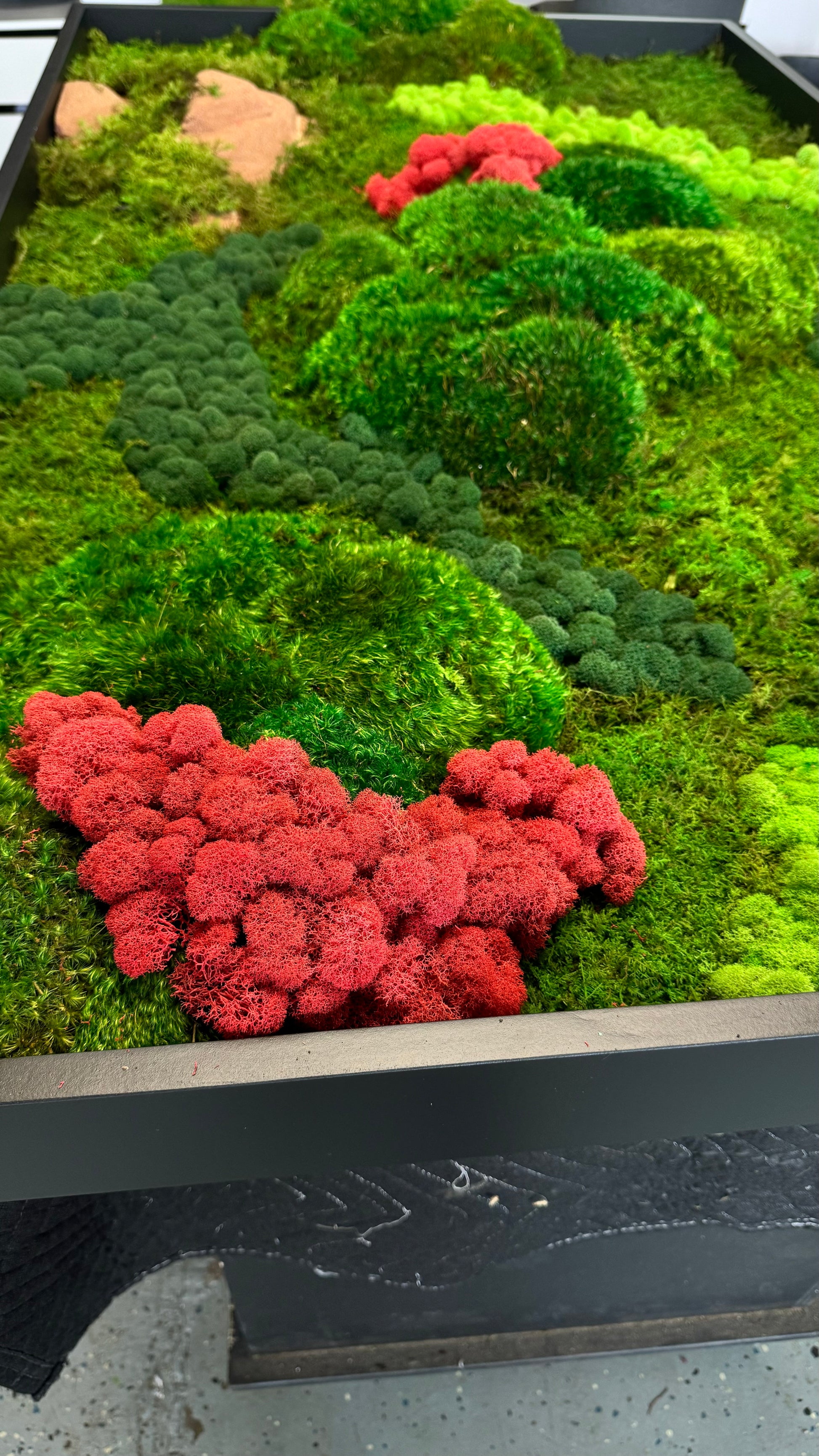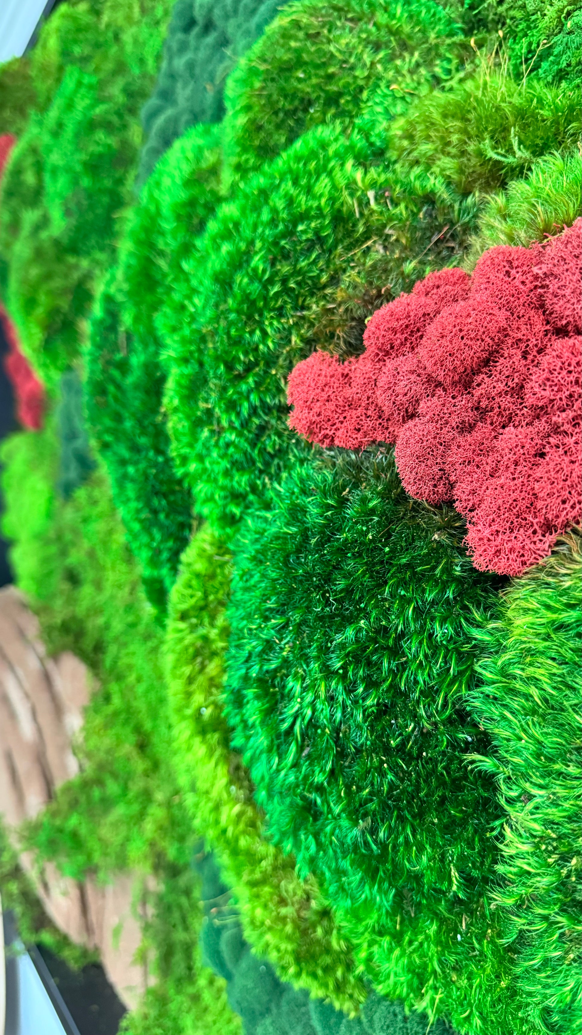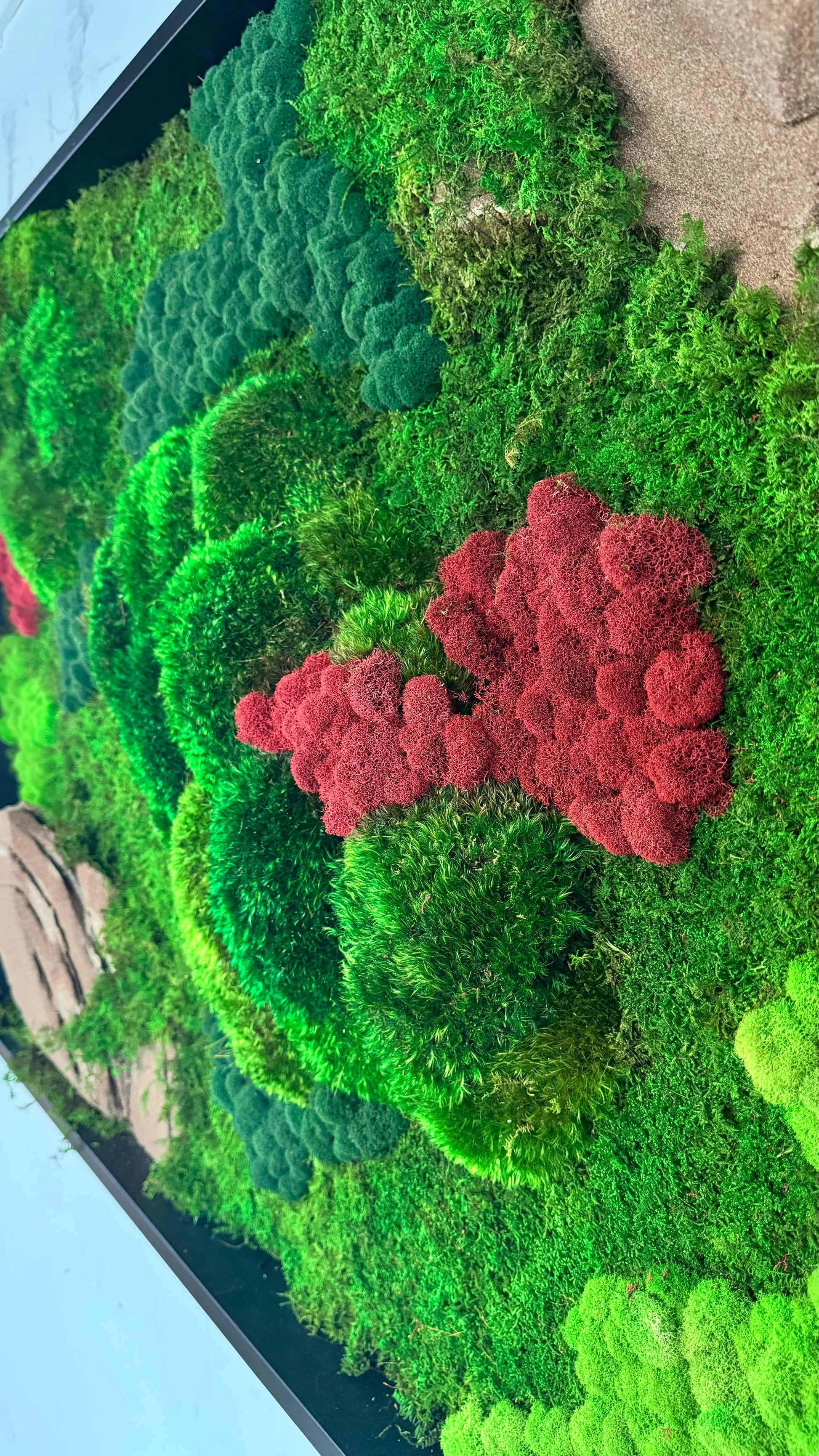 This Piece features a rich, layered arrangement of various preserved mosses in shades of green, ranging from bright green to deep forest hues. The composition includes bold accents of red moss, adding contrast and vibrancy to the organic landscape. The moss is arranged to create a sense of movement and depth, with different textures and heights mimicking natural terrain.