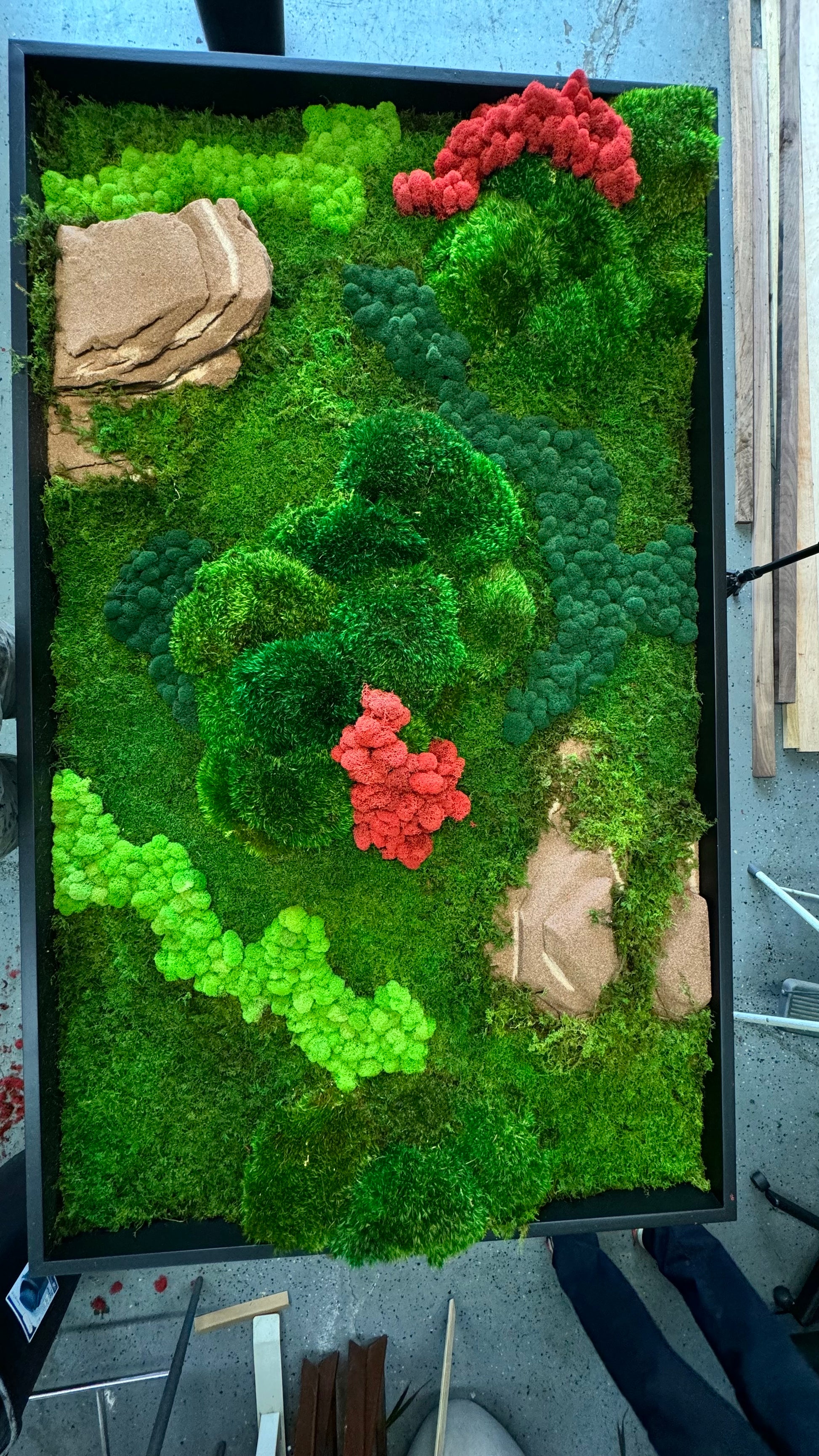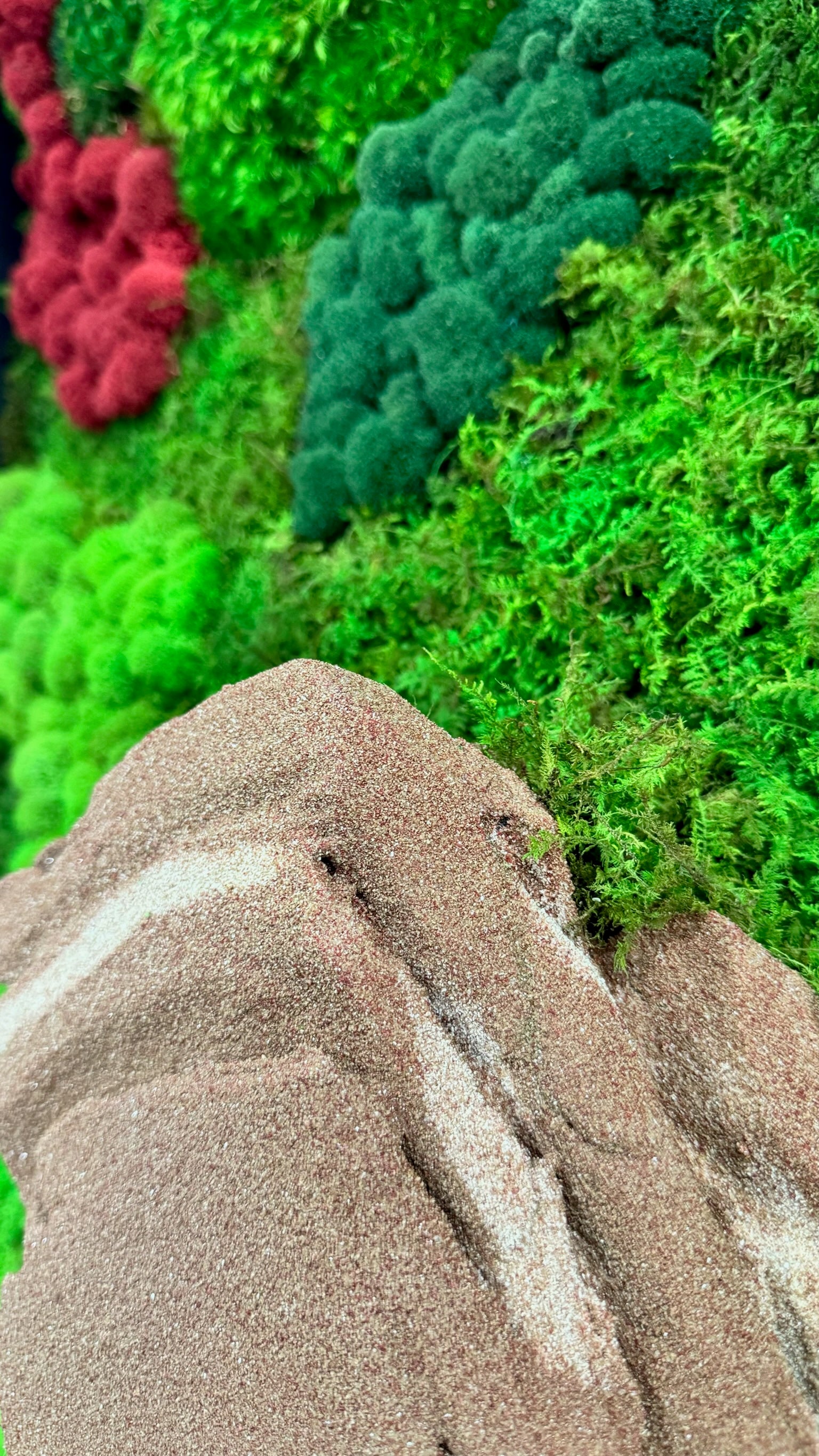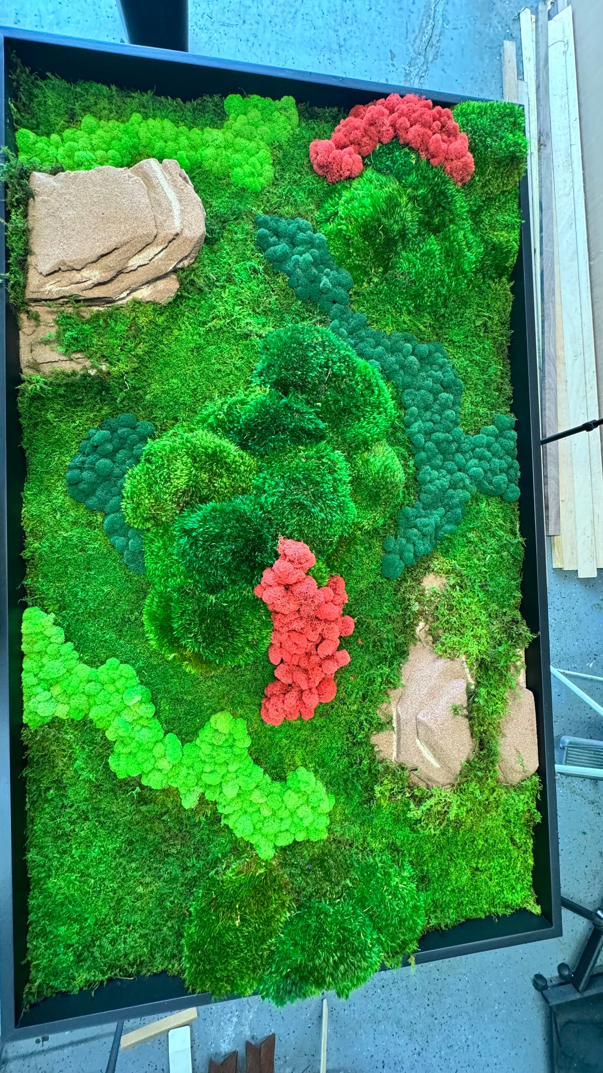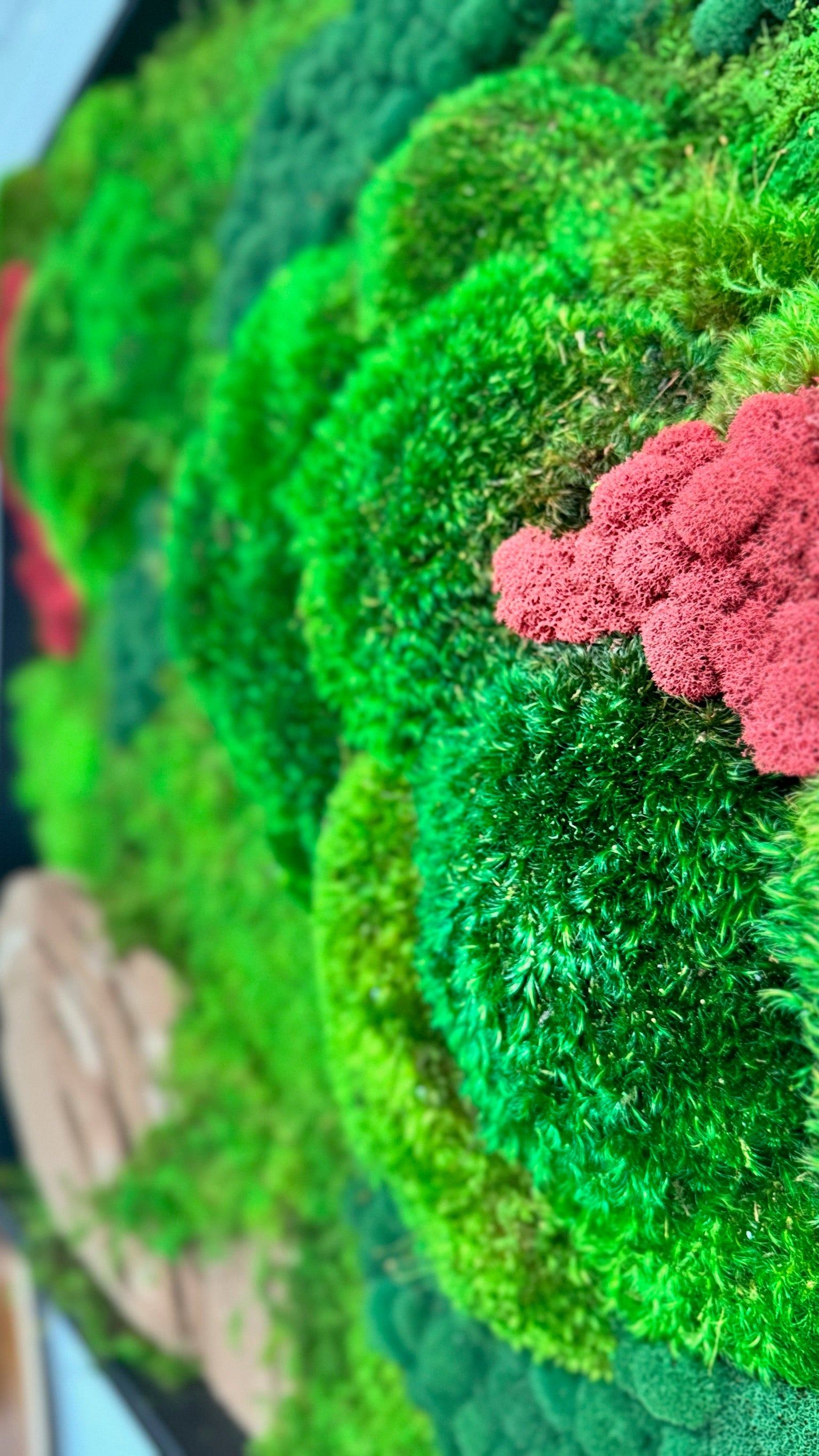 This Piece features a rich, layered arrangement of various preserved mosses in shades of green, ranging from bright green to deep forest hues. The composition includes bold accents of red moss, adding contrast and vibrancy to the organic landscape. The moss is arranged to create a sense of movement and depth, with different textures and heights mimicking natural terrain.