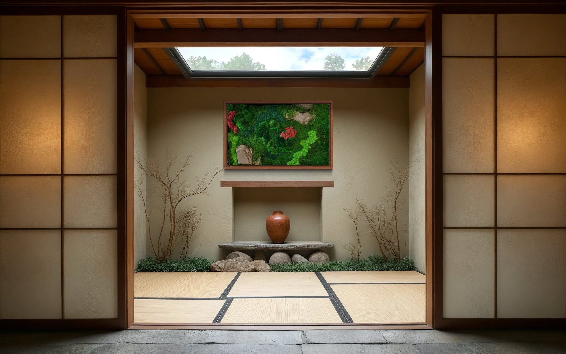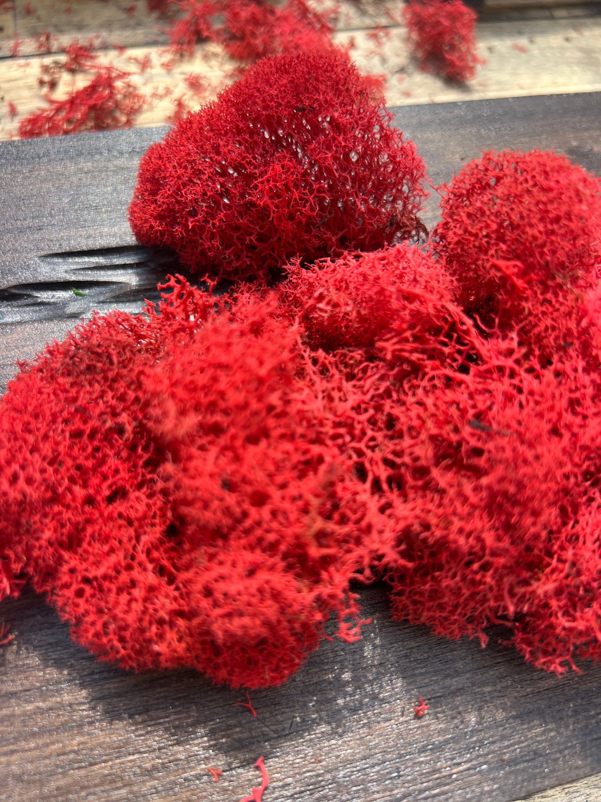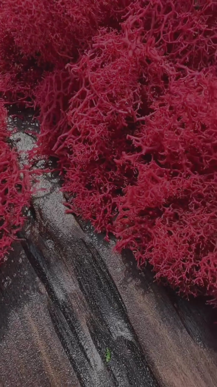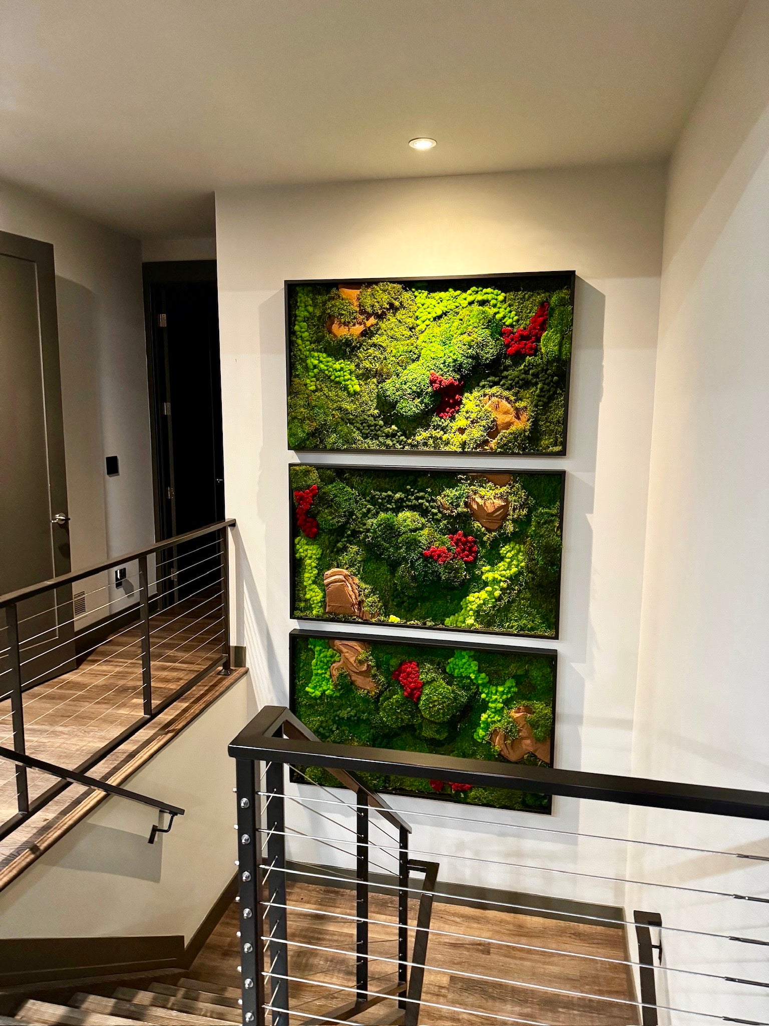 This Piece features a rich, layered arrangement of various preserved mosses in shades of green, ranging from bright green to deep forest hues. The composition includes bold accents of red moss, adding contrast and vibrancy to the organic landscape. The moss is arranged to create a sense of movement and depth, with different textures and heights mimicking natural terrain.