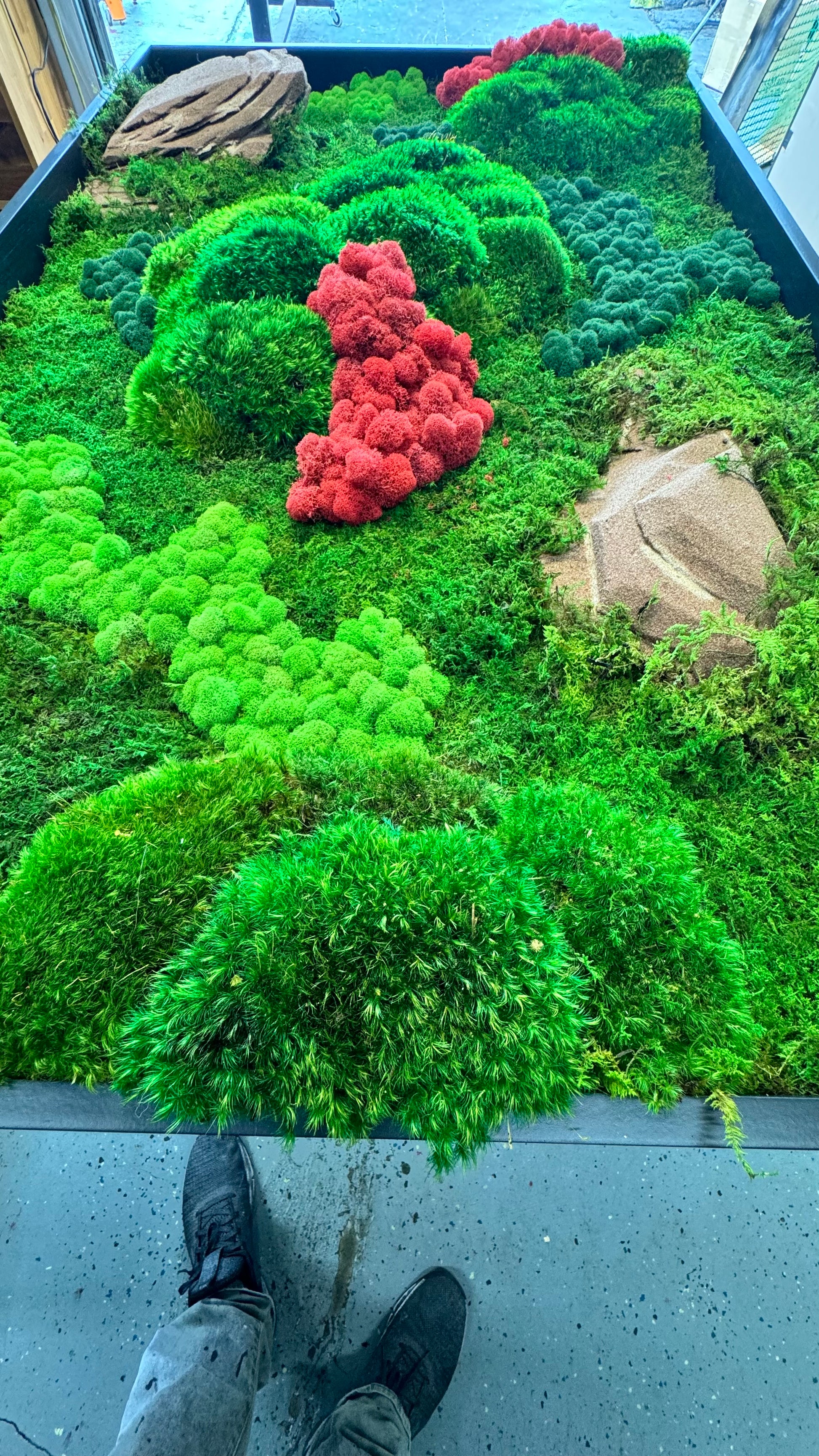 Immersed within the greenery are hand crafted faux red rocks, blending seamlessly into the mossy scene. The overall effect is calming and earthy, evoking the look of a miniature natural landscape.
