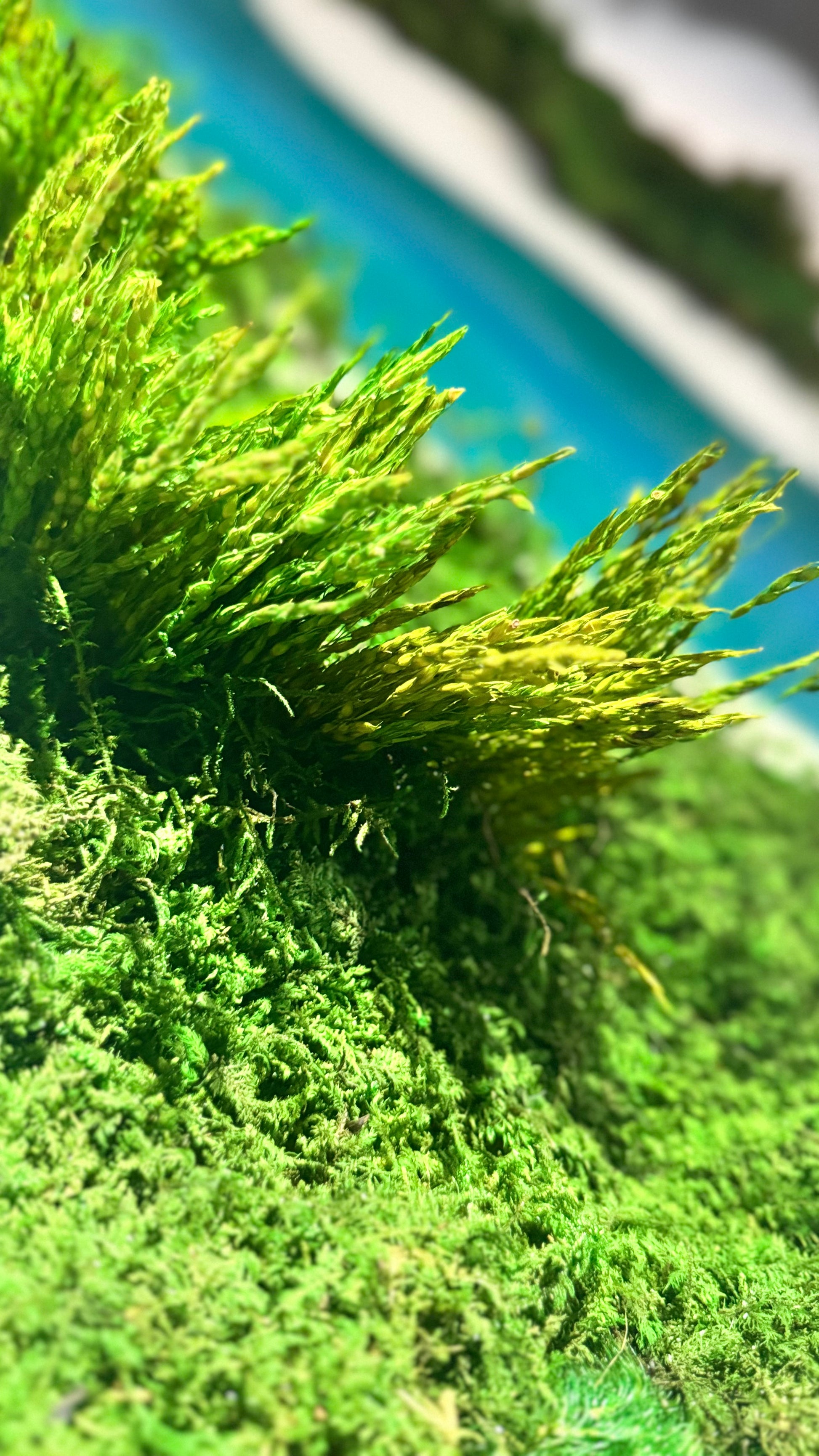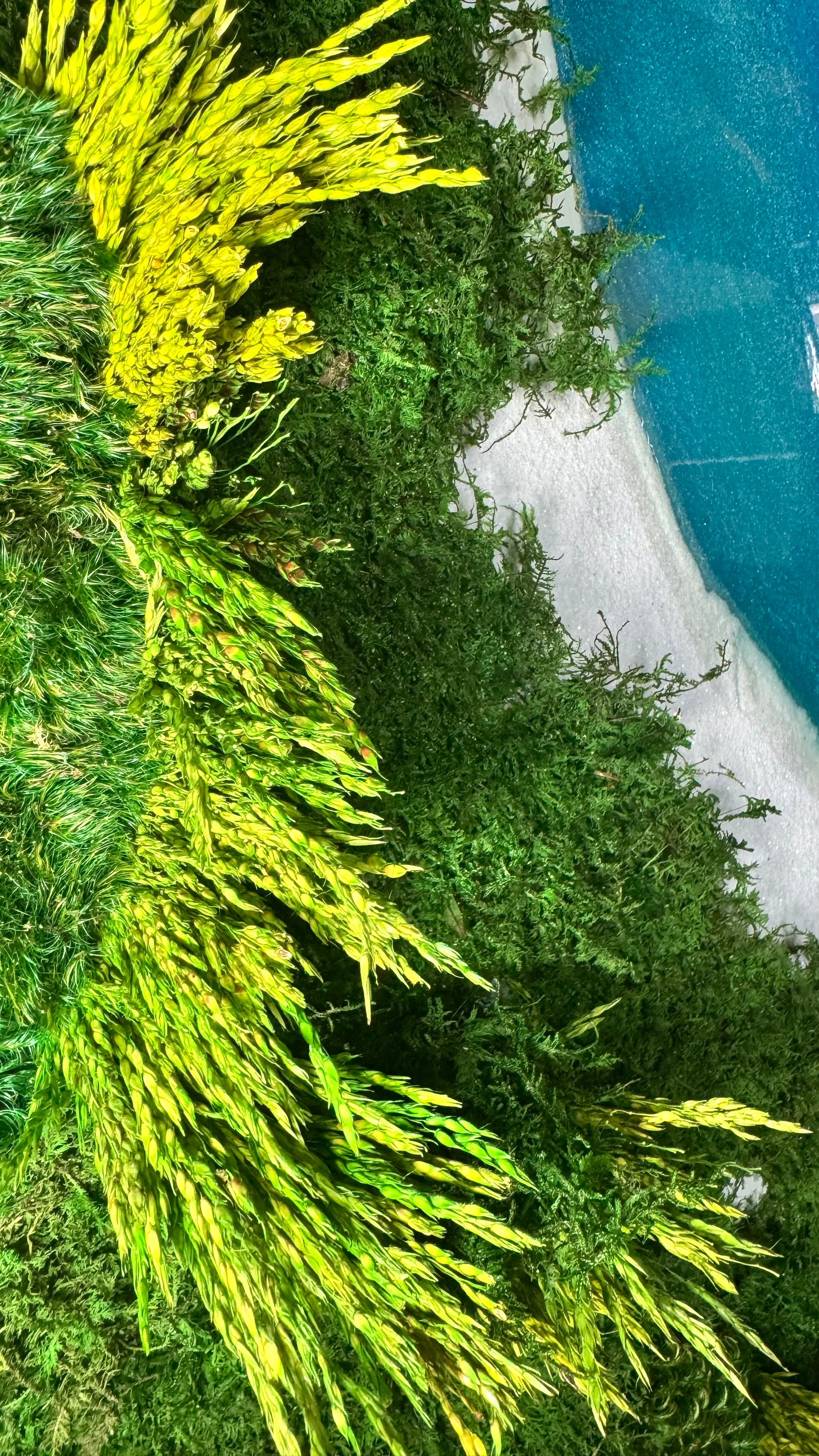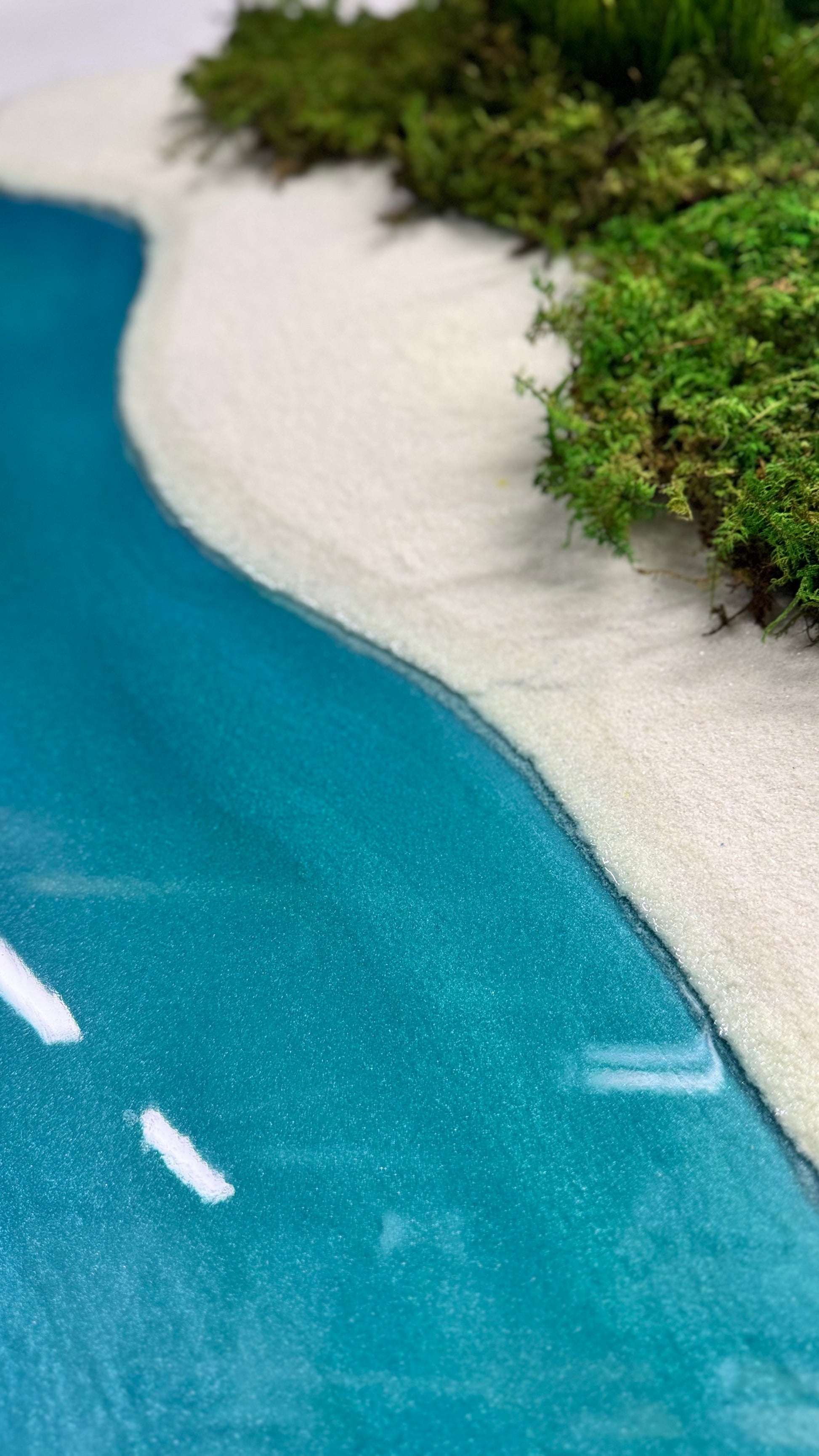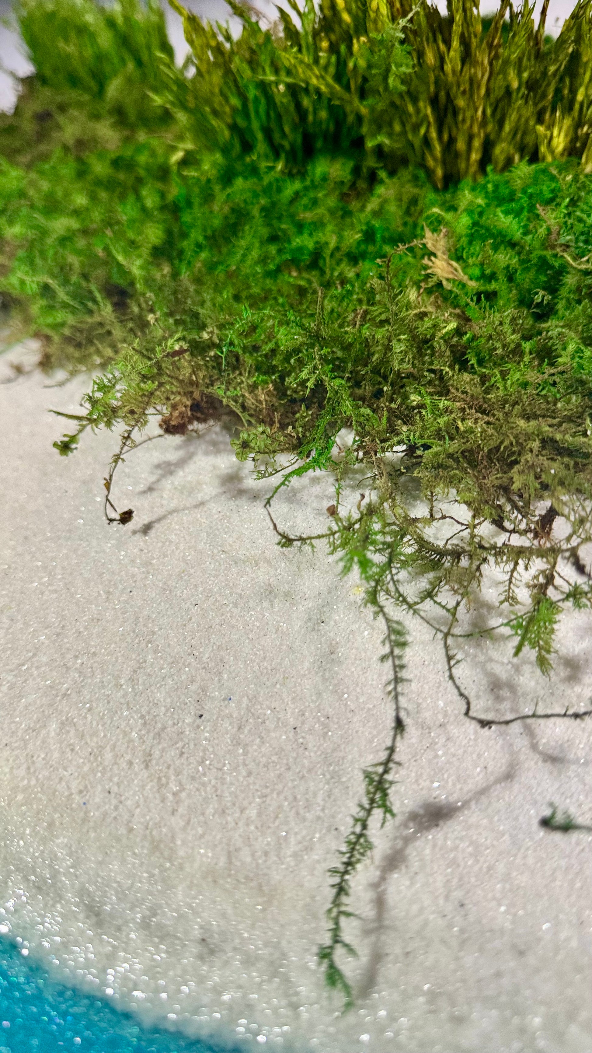 Inspired by a quiet stretch of coastline in San Diego, The Beach Meadows captures the stillness and awe of standing alone at the edge of the sea. Layered with soft white sand and hand-laid moss, this sculptural wall piece invites the viewer into a moment, where crashing resin waves meet textured terrain.