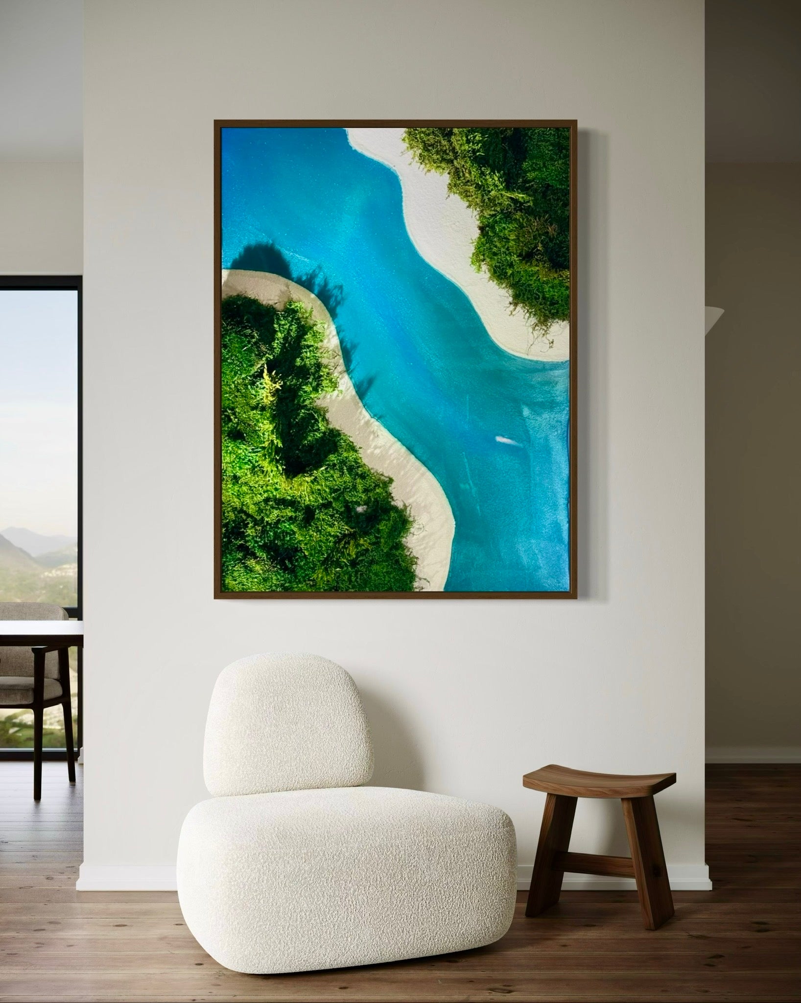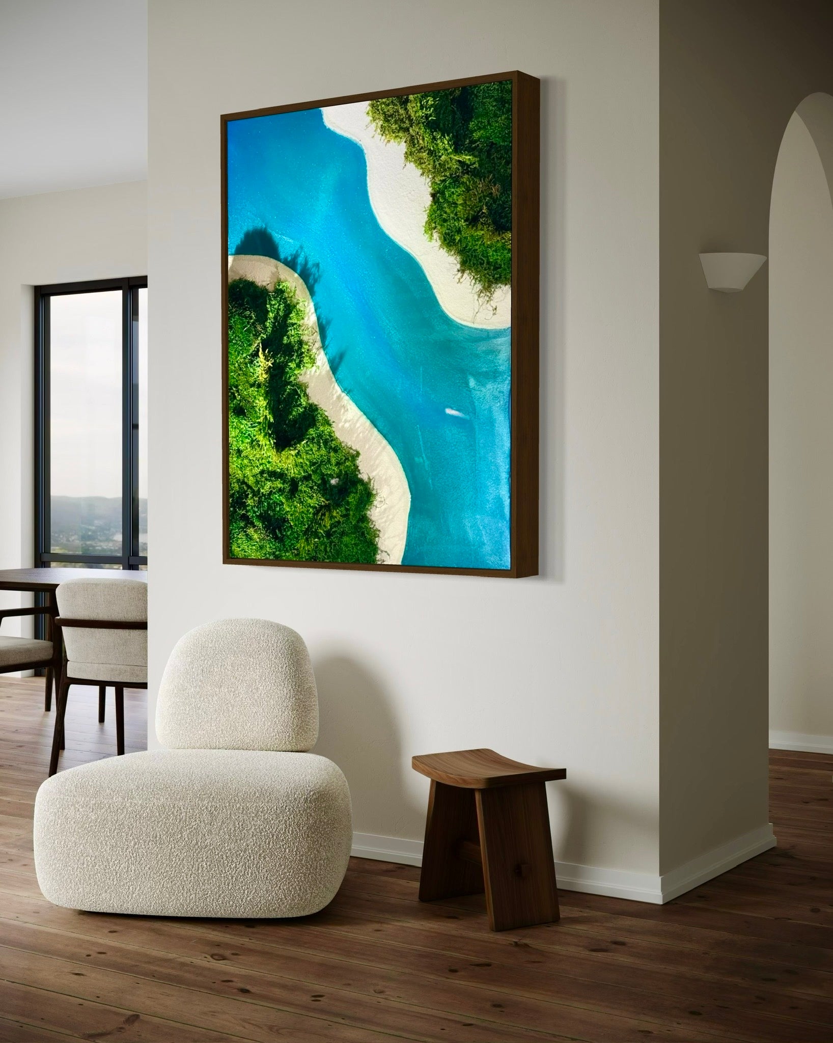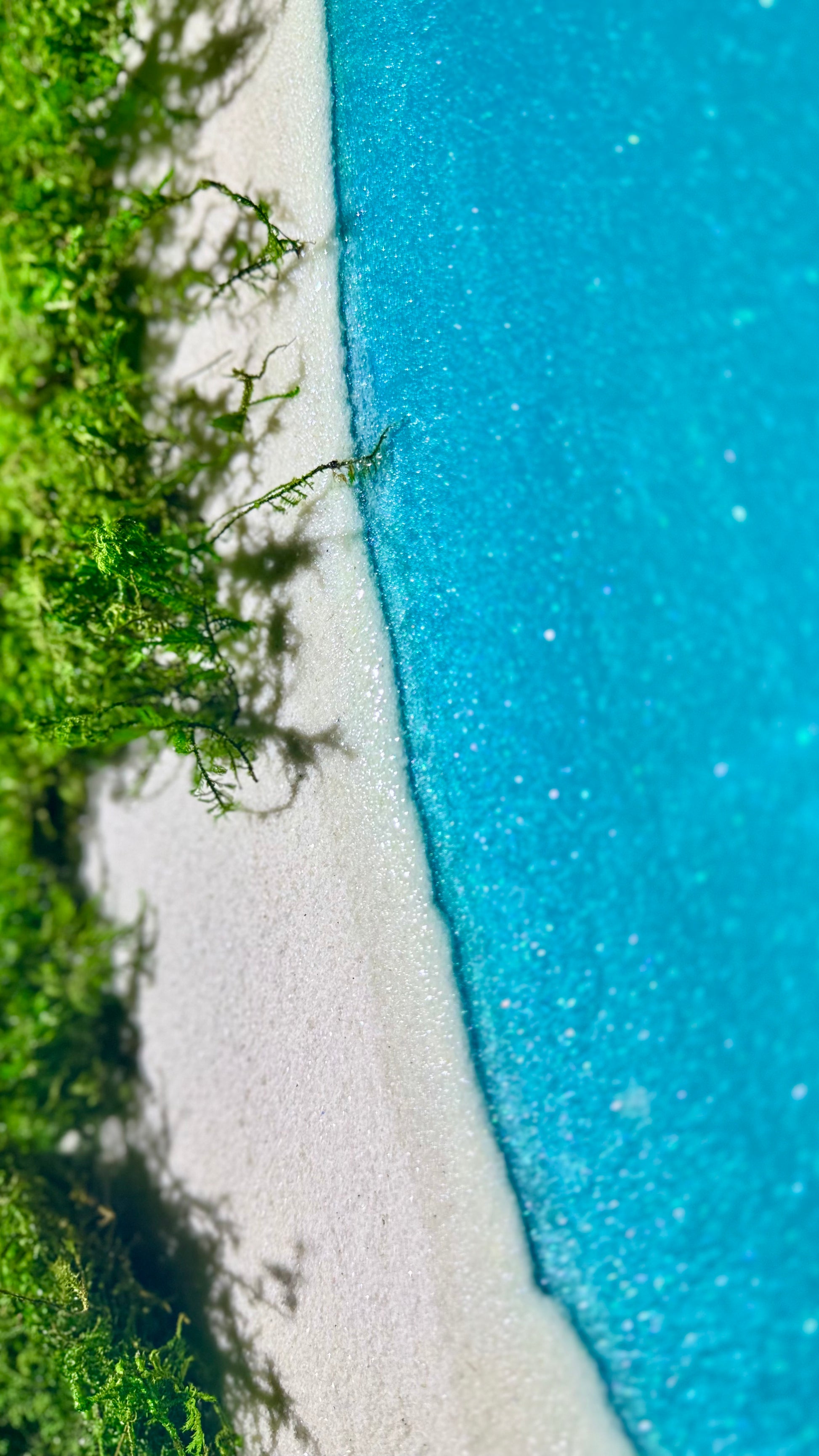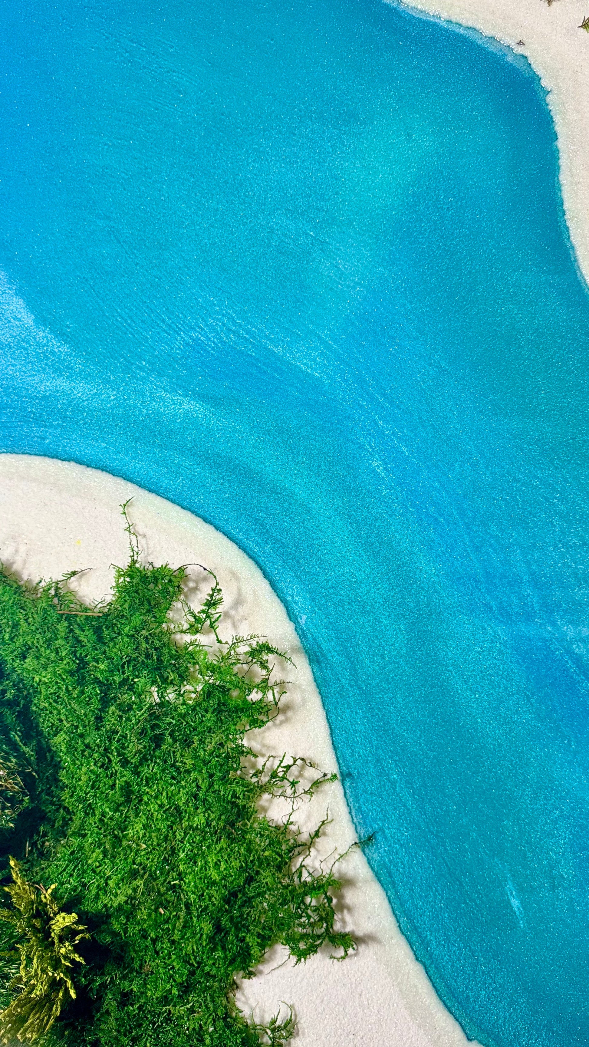 Inspired by a quiet stretch of coastline in San Diego, The Beach Meadows captures the stillness and awe of standing alone at the edge of the sea. Layered with soft white sand and hand-laid moss, this sculptural wall piece invites the viewer into a moment, where crashing resin waves meet textured terrain.