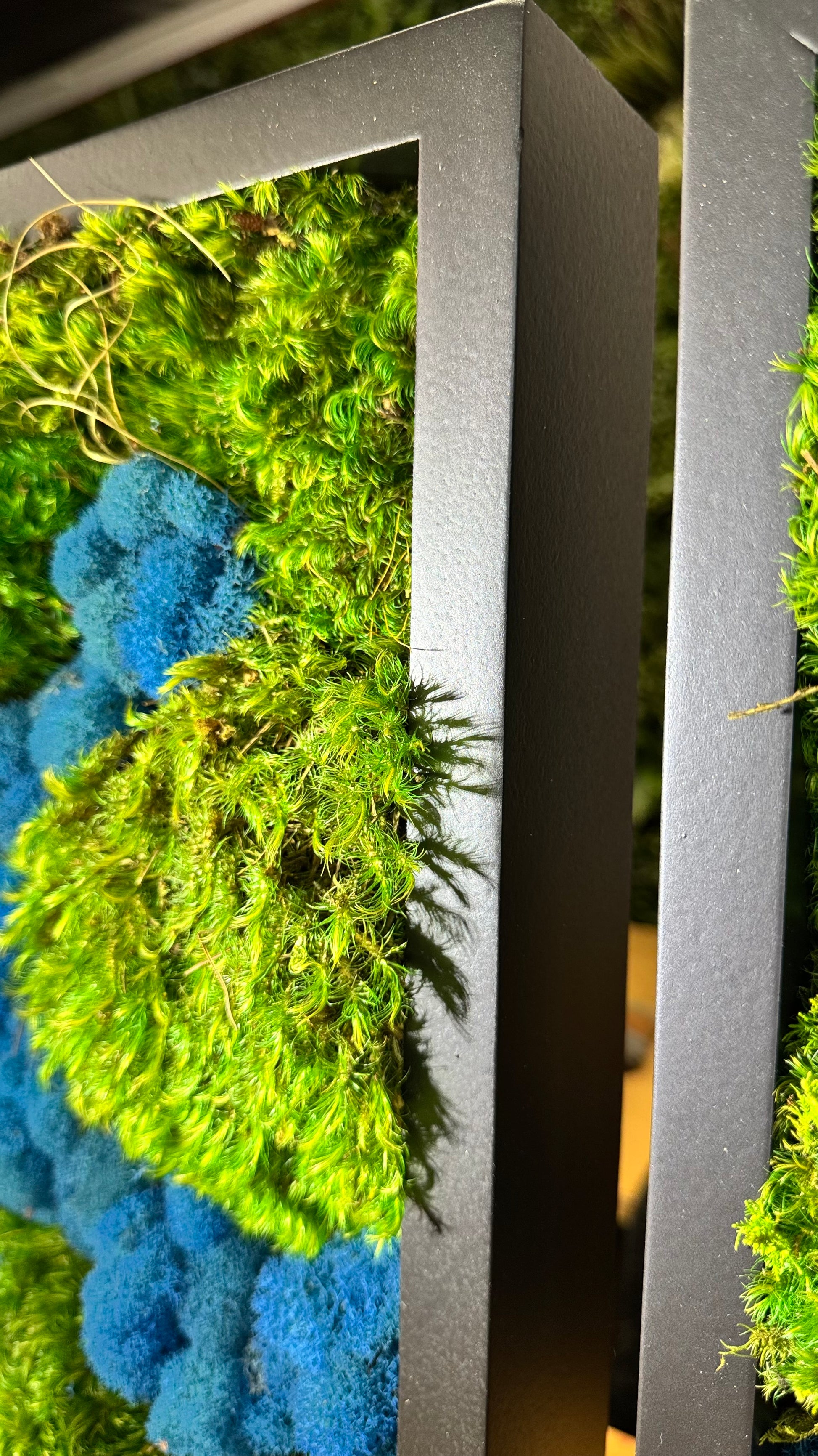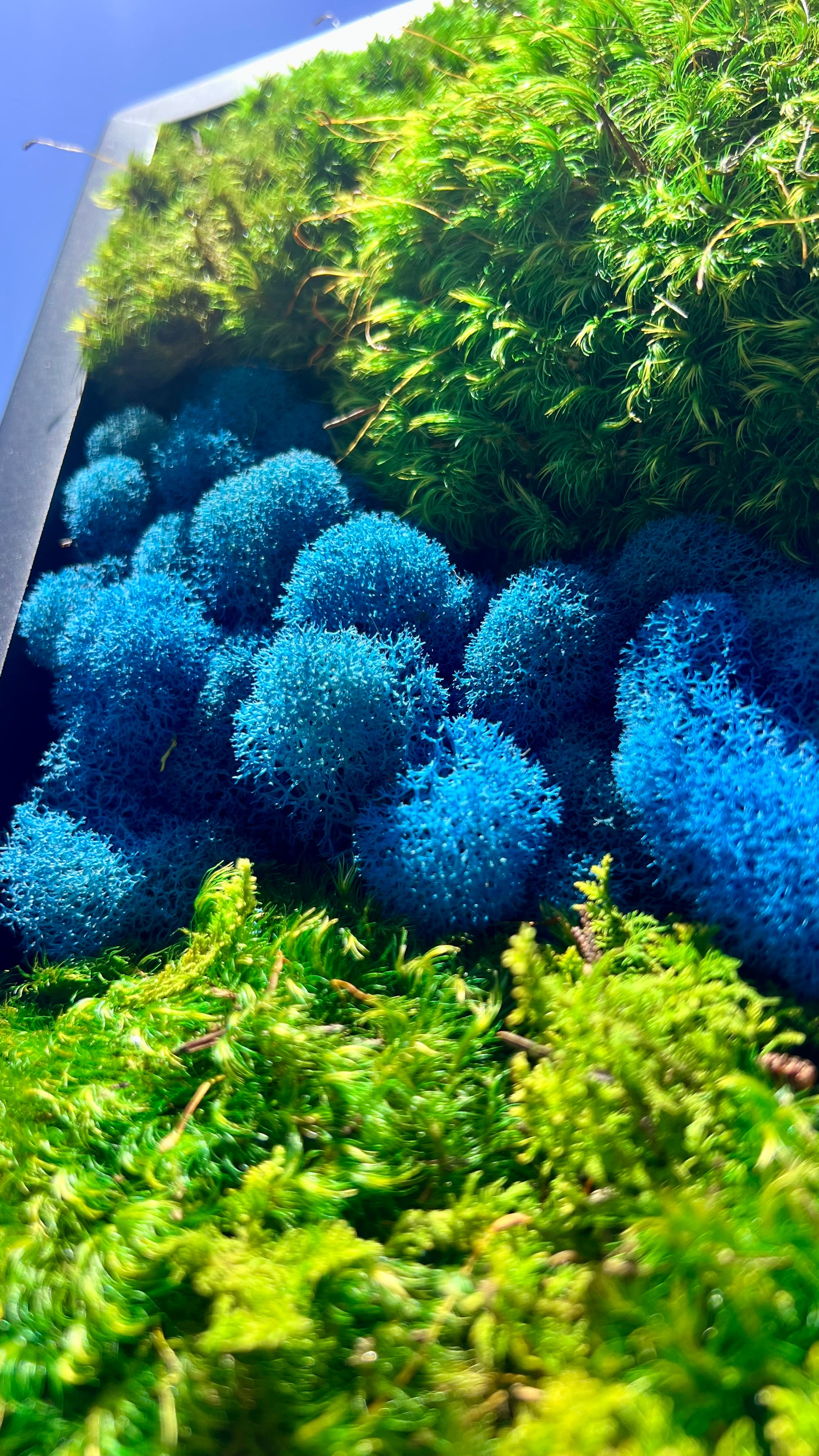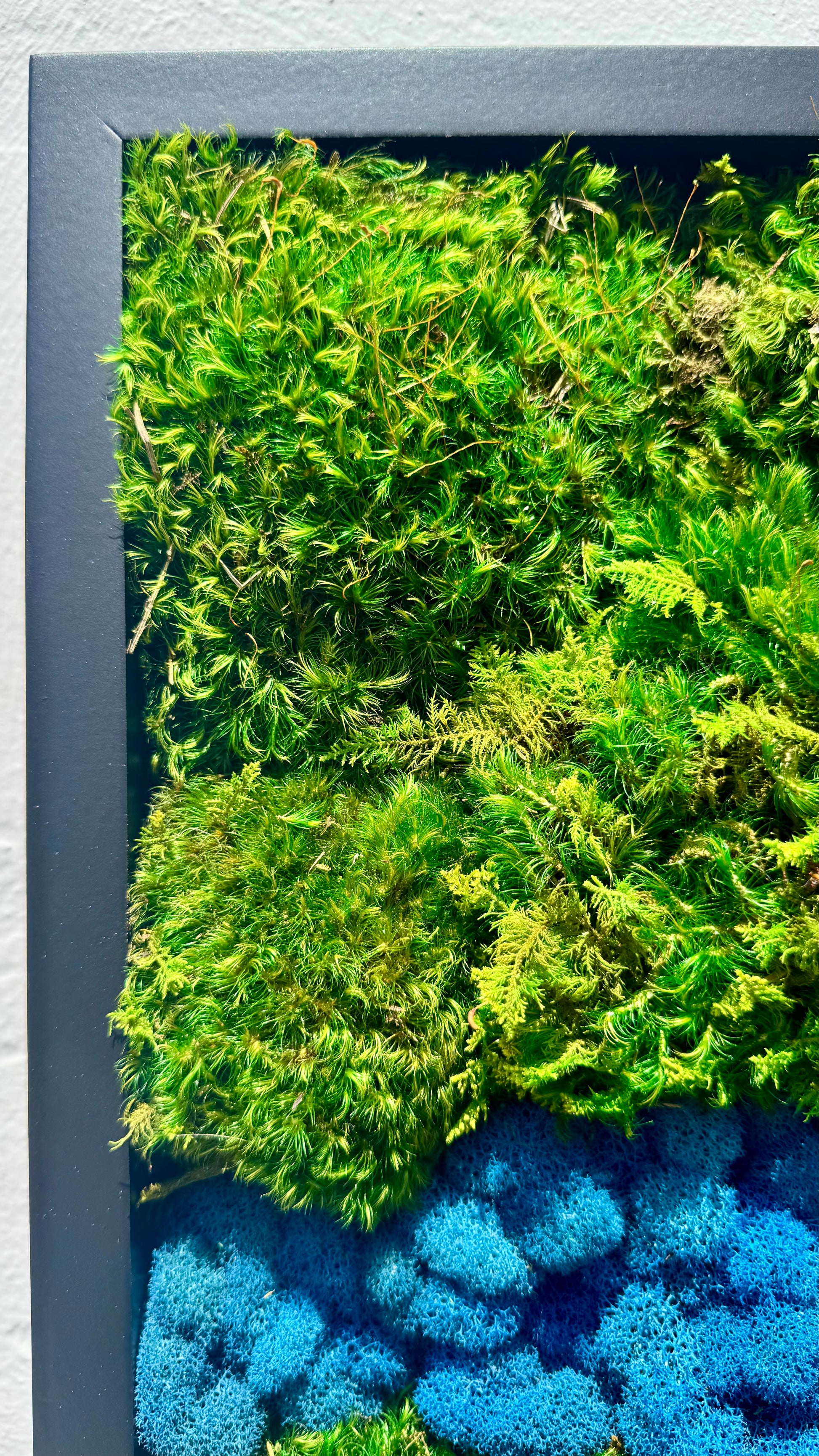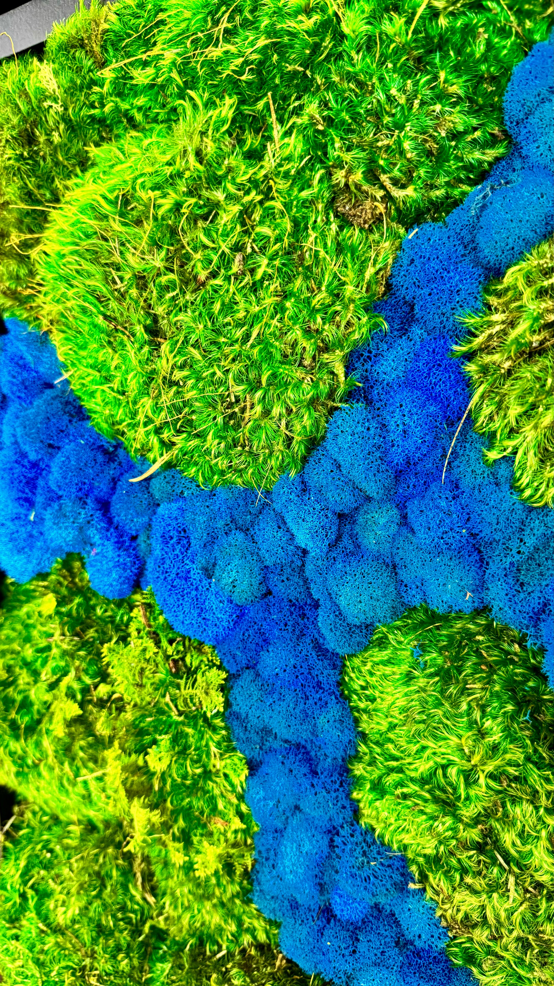 Where nature meets quiet strength. Enchanting River flows across three handcrafted frames, weaving a story of movement, contrast, and calm. Vivid green mosses, lush, preserved, and full of life, cradle a striking current of deep blue reindeer moss, creating the illusion of water threading through a living landscape. Every element is placed by hand, with intention and artistry.