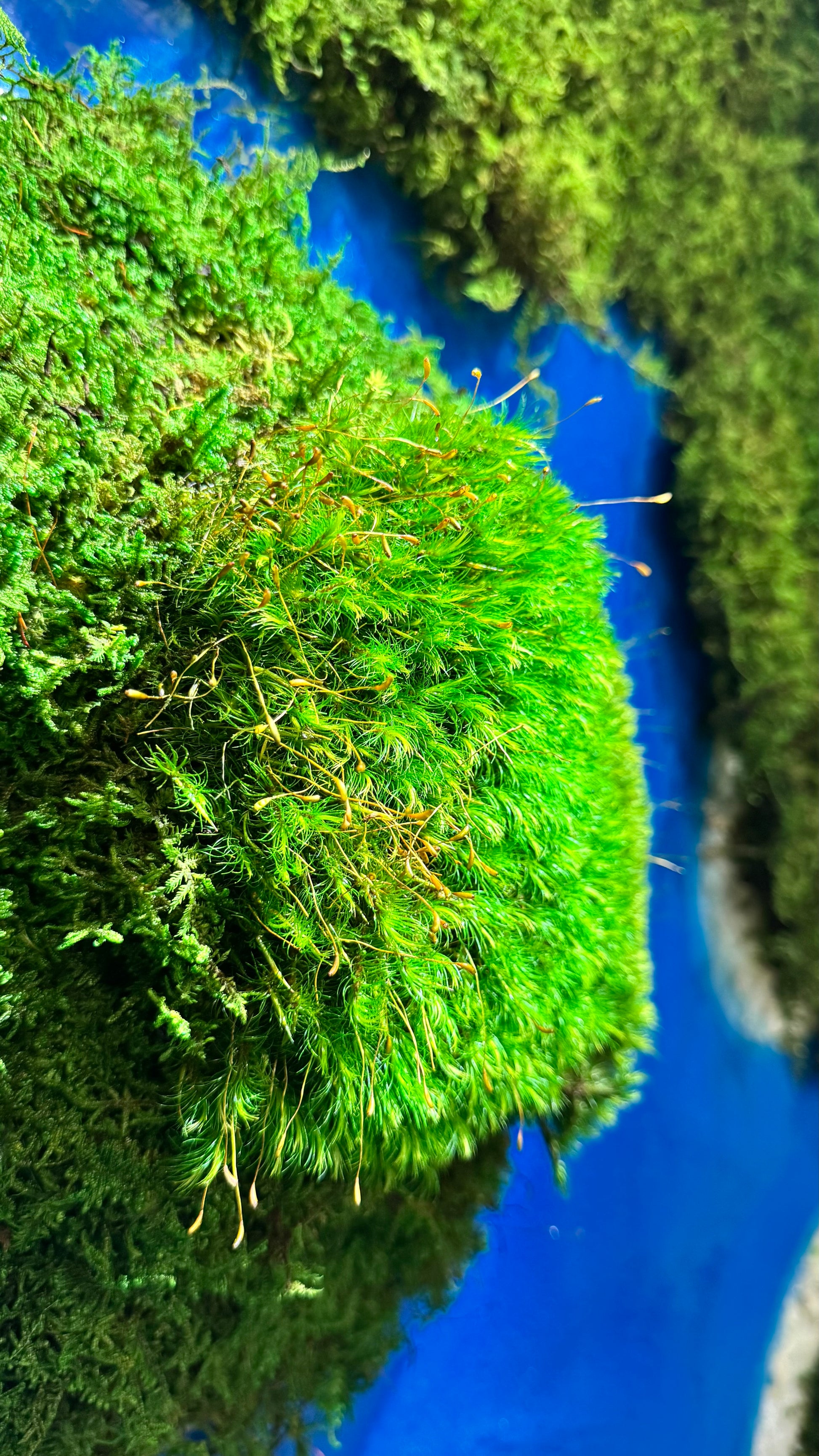 Surrounding them, layered pillow and sheet moss create the impression of a forest encircling still water; an aerial meditation on terrain, isolation, and balance.