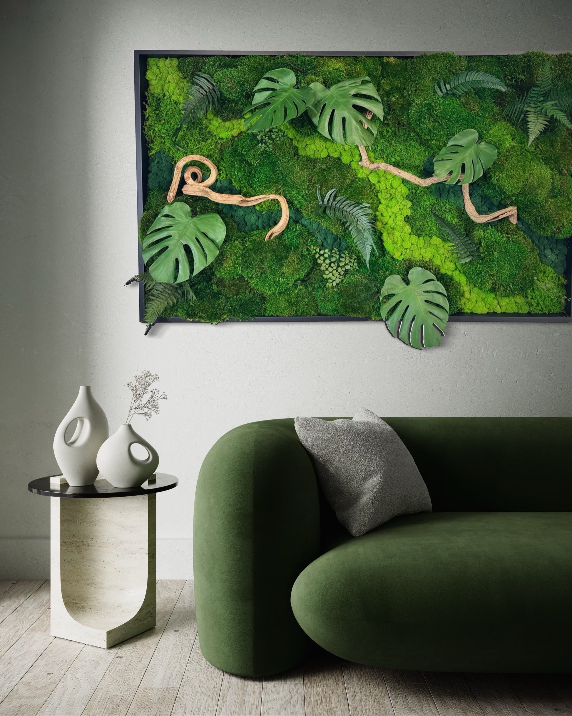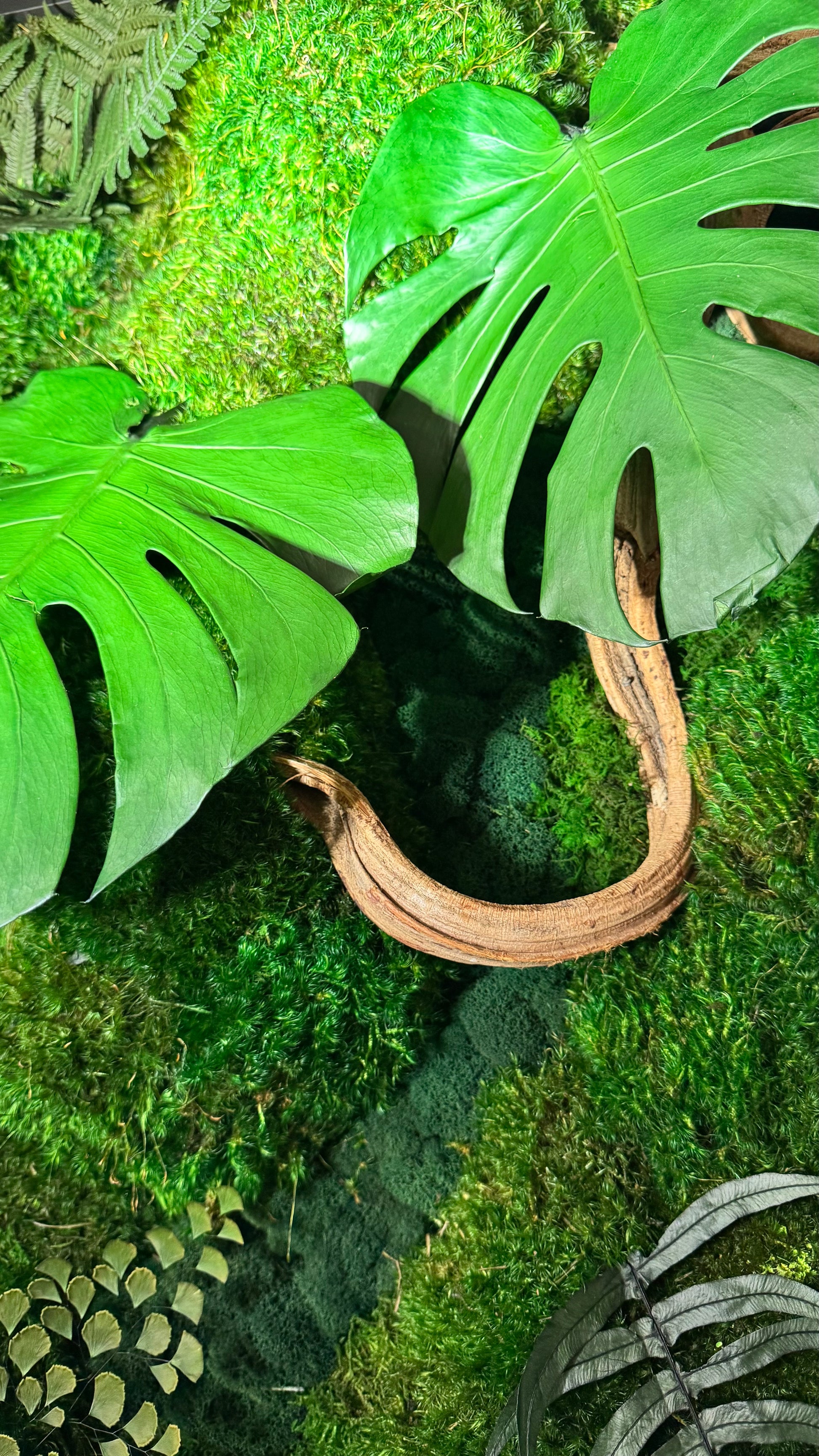 A living forest. The Terrarium is an immersive vertical landscape that channels the lush interior of a tropical rainforest. Mounds of vibrant pillow moss rise like gentle hills, flanking a central river of soft reindeer moss that winds with natural rhythm through the composition. Thick jungle vines twist and stretch across the piece, anchoring the terrain in untamed elegance. Preserved monstera, with delicate ferns and lush rock foliage breathe life into this piece.